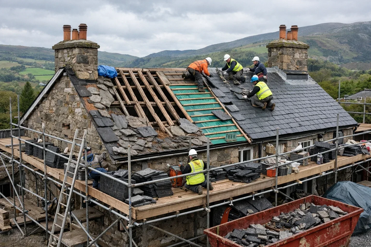 Common roof repair issues in North Wales include leaking roofs, broken or missing tiles, storm damage, damaged flashing, and general wear caused by prolonged exposure to the elements. These problems often worsen over time, allowing water to penetrate the roof structure and affect ceilings, insulation, and timber supports.